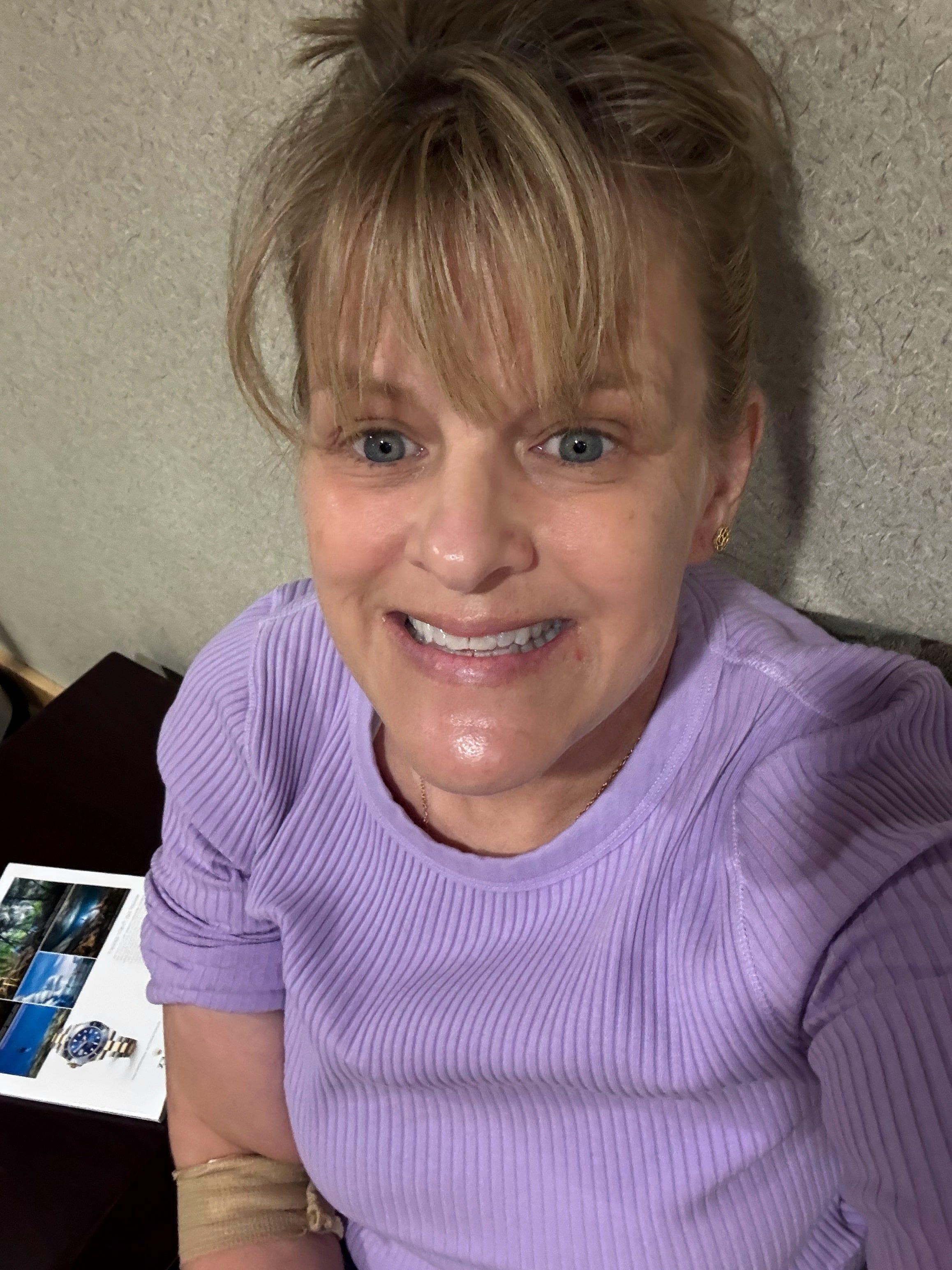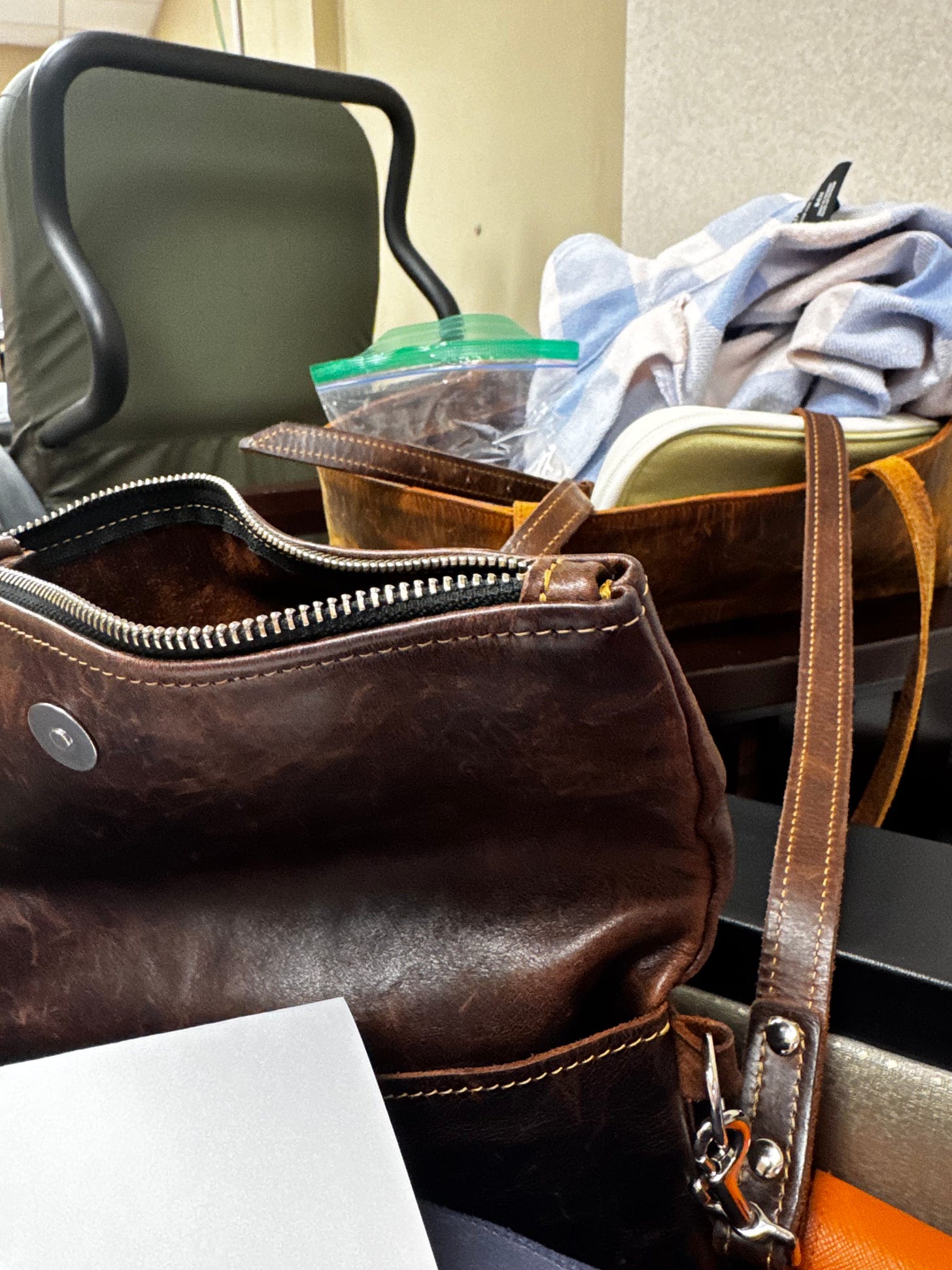 Photo 2 & 3: Me today, with my bag, holding lip balms galore , a smooshed bagel and cream cheese and an assorted knick-knacks, for my recurring six‑month infusion. All this for me probably working on this Substack from my phone.